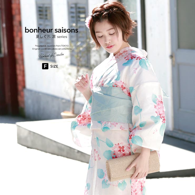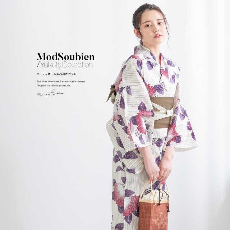【10%OFFクーポン!12/11(木)1:59まで】SOUBIEN 浴衣 セット レディース 浴衣セット 半幅帯 大人 3点セット ボヌールセゾン 白 オフホワイト 赤紫 グレージュ 紫陽花 縞 ストライプ 綿麻 夏 花火大会 モダン フリーサイズ 浴