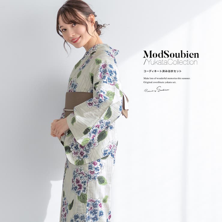 【10%OFFクーポン!12/11(木)1:59まで】SOUBIEN 浴衣 セット レディース 浴衣セット 兵児帯 2023新作 大人 3点セット グレー系 紫 紫陽花 あじさい 花 グレージュ ボヌールセゾン フリーサイズ 浴衣・着物