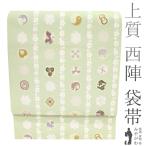袋帯 西陣 金糸 アスパラガスグリーン 猫 象 狸 イルカ 馬 龍 魚 勾玉 花 カジュアル セミフォーマル 中古 仕立て上がり みやがわ sb51175