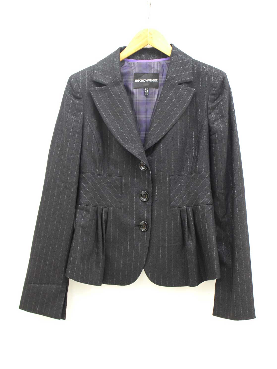 【新規SALE】『EMPORIO ARMANI/エンポリオ アルマーニ』シングルブレストストライプウールジャケット/ストライプ/シンプル/アウター/長袖 ブラック×シルバー系/黒系×銀色系 レディース US4 【中古】 秋冬 otr 319042
