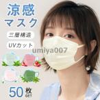 涼感マスク 平ゴム 50枚 使い捨て ミント 接触冷感 涼しい クール カラーマスク 血色大人用 3層構造 不織布 清涼感 通気 感染予防