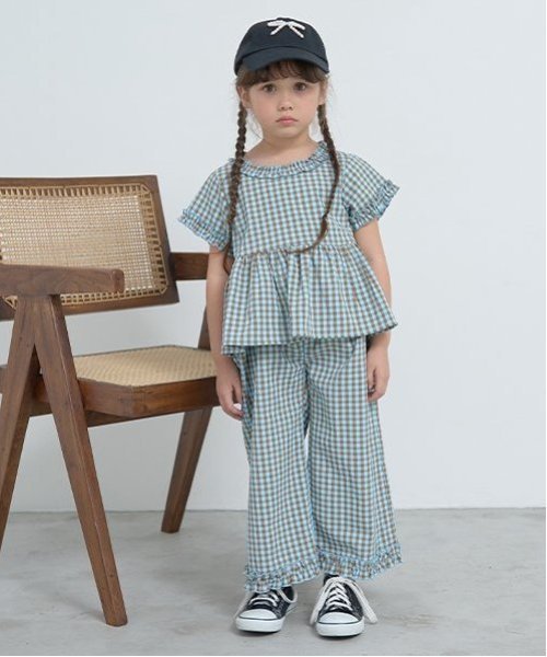 【SALE/30%OFF】Lycee mine 【セットアップ】フリルブラウス&フリルワイドパンツ ナルミヤオンライン トップス アンサンブル グリーン ブルー グレー