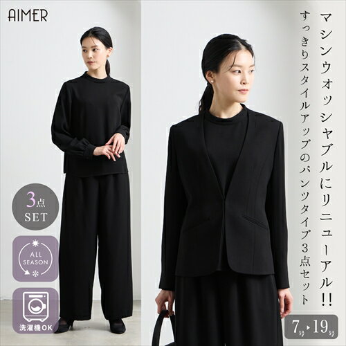 【ノベルティプレゼント対象商品】【リニューアル!!マシンウォッシャブル生地】【洗える】【喪服・礼服】【WEB限定】パンツタイプ3点セットブラックアンサンブル(ノーカラージャケット・ブラウス・ワイドパンツ)