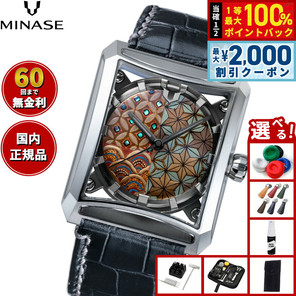 【店内ポイント最大52倍!本日限定!】【60回分割手数料無料!】ミナセ MINASE 腕時計 メンズ 自動巻き JAPAN ART COLLECTION URUSHI 漆 〜蒔絵〜 SEVEN WINDOWS 小紋 レザーモデル VM15-LBKMA2-SSD
