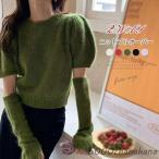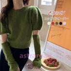 ニット 半袖 ボウタイアームウォーマー ニットプルオーバー 2WAY レディース トップス プルオーバー セーター ニットセーター クルーネック ボリューム袖 無地