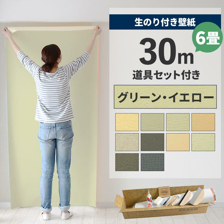 壁紙 のり付き 30m 道具 セット クロス 張り替え 自分で 無地 黄色 イエロー 緑 グリーン 貼り方マニュアル付き 初心者セット 6畳