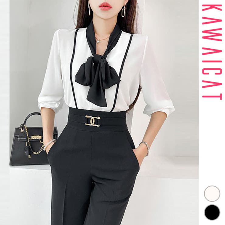 【10%OFFクーポン!12/11(木)1:59まで】KawaiCat ブラウス レディース トップス シャツ 長袖 ボウタイ リボン タイ カットソー 配色 バイカラー Vネック上品 きれいめ おしゃれ オフィス お仕事 お呼ばれ 結婚式 二次会 春