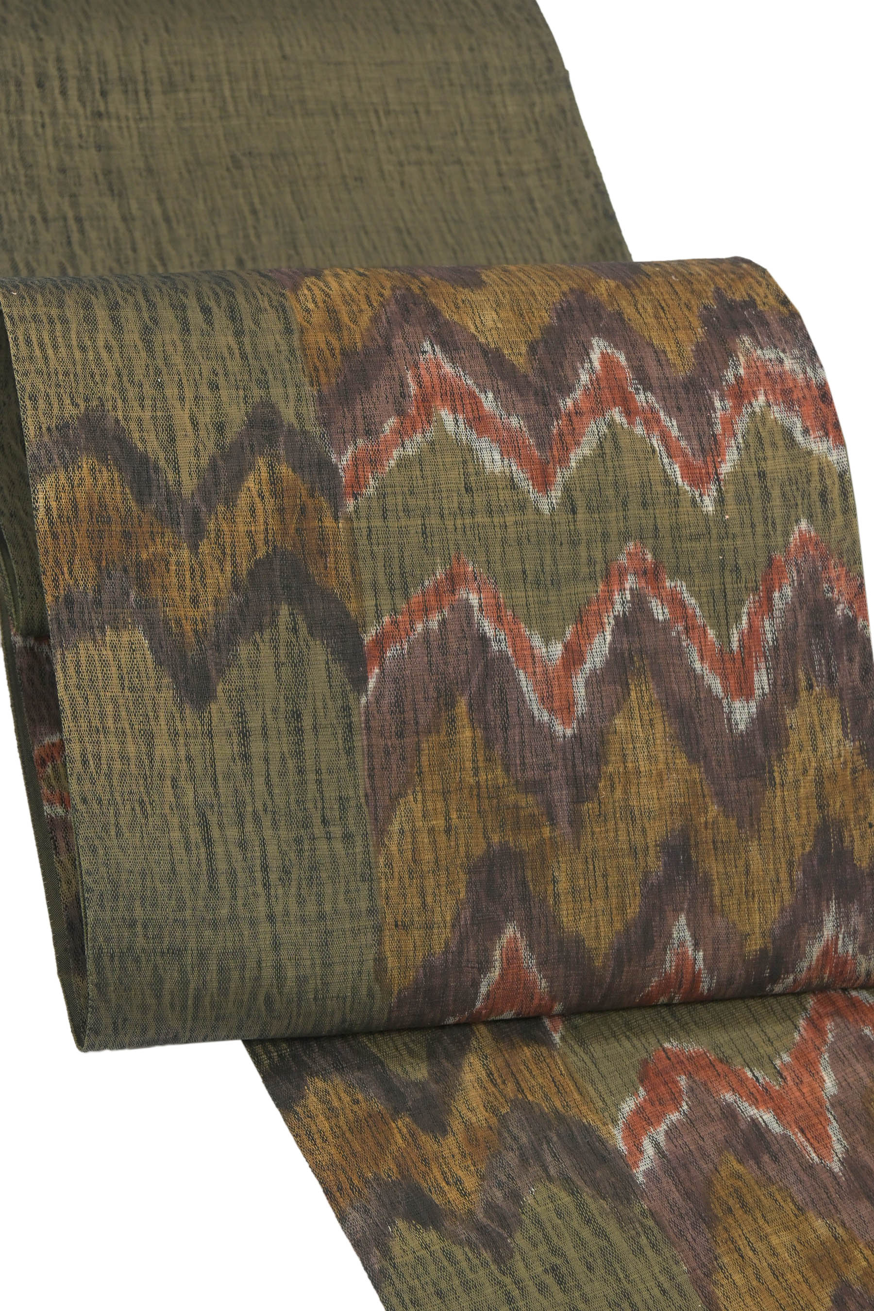 【ブラックフライデー限定】 【坂下織物】 特選西陣織紬袋帯 すくい織・手織染彩織 「風趣イカット山路間道紋」 今はなき名門の高級ライン 力強い印象の洒落袋帯