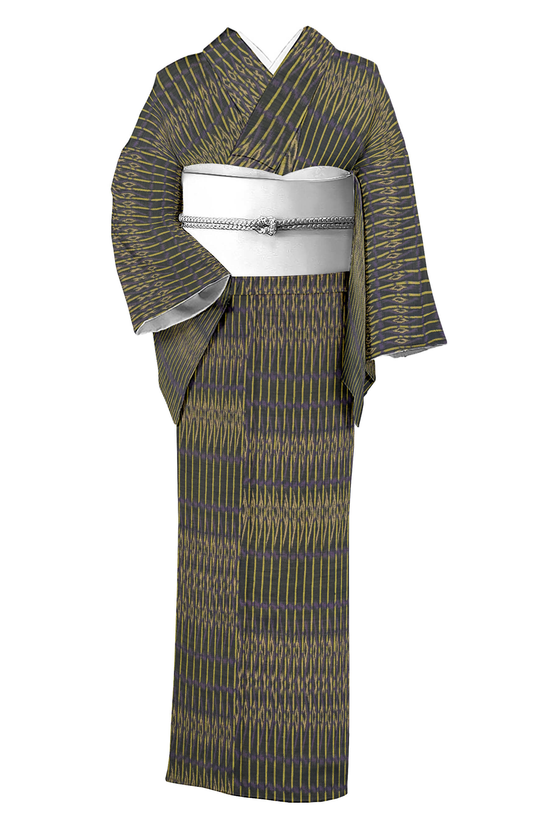 【菱屋六右ェ門】 特選西陣織両面御召 ≪御仕立て上がり・中古美品≫ 「イカット装飾段紋」 しなやかで着心地よく こだわりのカジュアル 身丈159 裄64