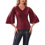 Allegra K レディース Vネック ブラウス スプリットスリーブ ドレッシー トップ イブニングパーティー トップス Tシャツ 赤M