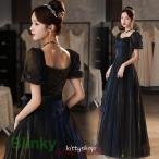 イブニングドレス ロングドレス 黒 パフスリーブ 発表会ドレス ロング丈 Aライン パーティードレス ブラック 結婚式ドレス 二次会ドレス オシャレ 演奏会ドレス