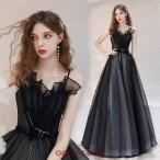 イブニングドレス 黒 ロングドレス キャミドレス ブラック 発表会ドレス 演奏会ドレス チュール パーティードレス 二次会ドレス お呼ばれドレス ロング Aライン