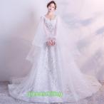 ウエディングドレス ロングドレス 二次会 花嫁 Aラインドレス パーティドレス 結婚式 ウェディグドレス レース 前撮り 編み上げ 刺繍 大きいサイズ 袖あり 大人