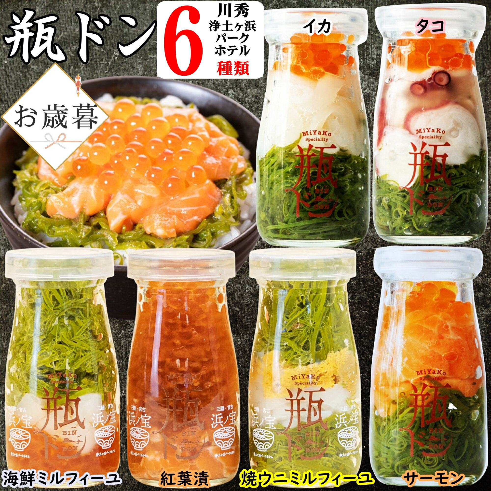 【スーパーSALE10%OFF】 お歳暮 ギフト 瓶ドン ( イカ タコ サーモン 海鮮ミルフィーユ 紅葉漬 焼ウニミルフィーユ) 6本セット 瓶丼 瓶どん 海鮮丼 ビン丼 海鮮 瓶 瓶詰め 海鮮お歳暮 ご飯のお供 海鮮丼セット 海鮮グルメ どんぶりの素 ご飯にかける ご飯に合う 海鮮丼の具