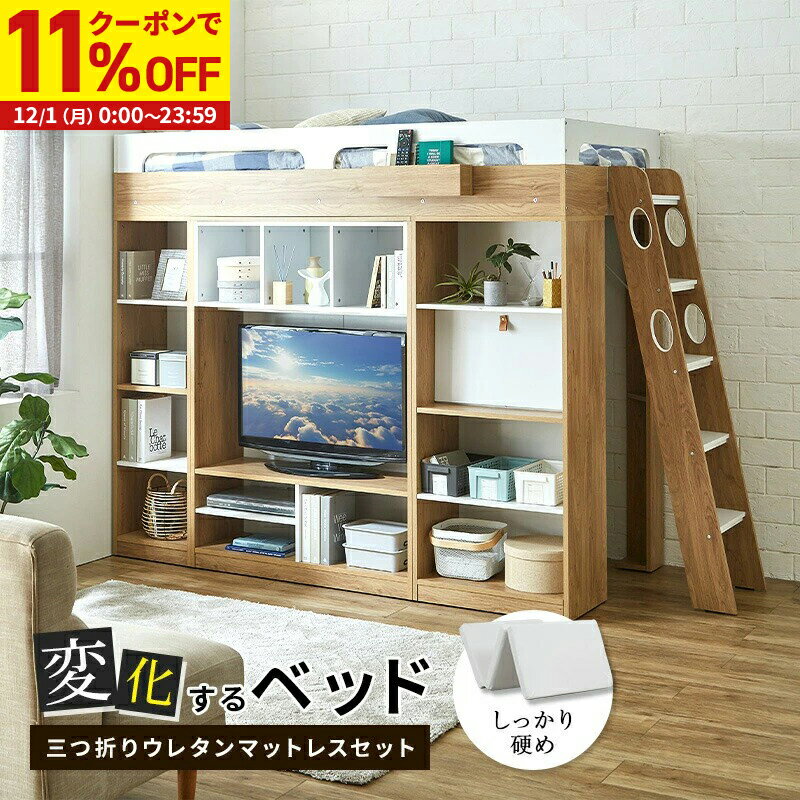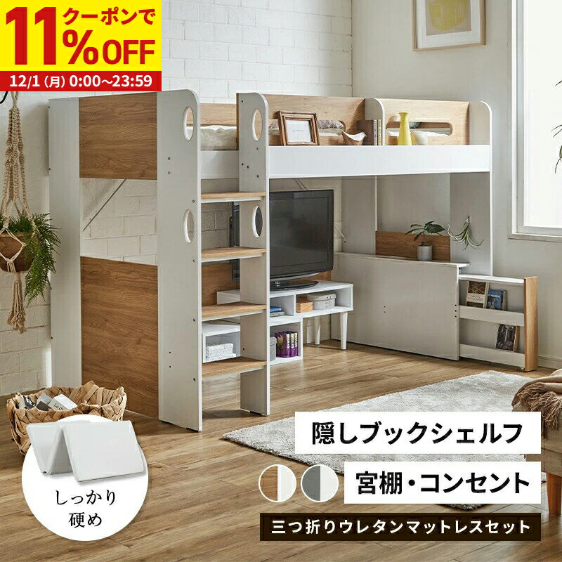 【11%OFFクーポン配布中★12/1に使える】 システムベッド ロフトベッド シングル ロフト ベッド マットレス付き ウレタンマットレス マットレスセット 高反発 三つ折り 3つ折り 木製 収納 ベッド下収納 テレビシェルフ デスク 収納付き 一人暮らし