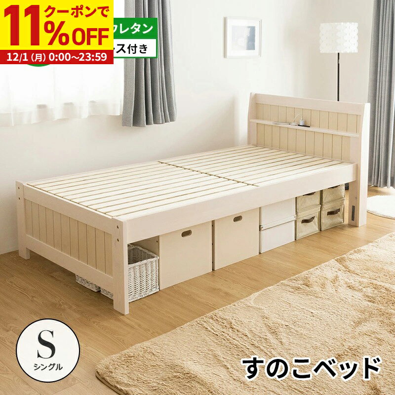 【11%OFFクーポン配布中★12/1に使える】 すのこベッド ウレタンマットレス付 ベッド シングル コンセント付 頑丈 シンプル 天然木フレーム 親ベッド 単品 高さ2段階 脚 高さ調節 敷布団 シングルベッド すのこ 木製