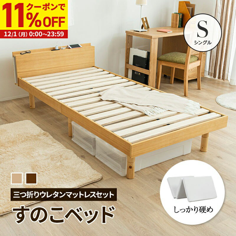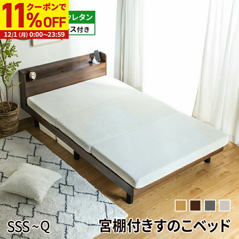【11%OFFクーポン配布中★12/1に使える】 ベッド マットレス付き すのこ ウレタンマットレス マットレスセット 高反発 三つ折り セミシングルショート セミシングル シングル セミダブル ダブル クイーン すのこベッド 棚付き 北欧風 ベット おしゃれ
