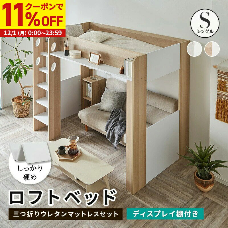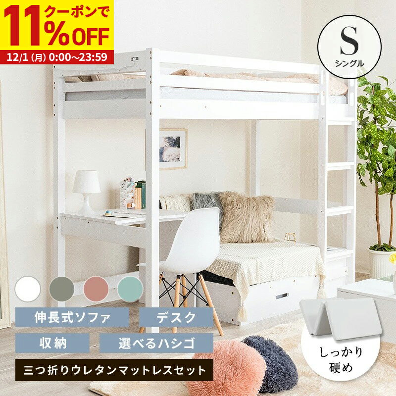 【11%OFFクーポン配布中★12/1に使える】 ロフトベッド シングル ロフト ベッド マットレス付き ウレタンマットレス マットレスセット 高反発 宮付き ベッド下収納 子供部屋 システムベッド 収納 収納付き 木製 フレーム 子供 キッズ 一人暮らし 寮 ゲストハウス 民泊