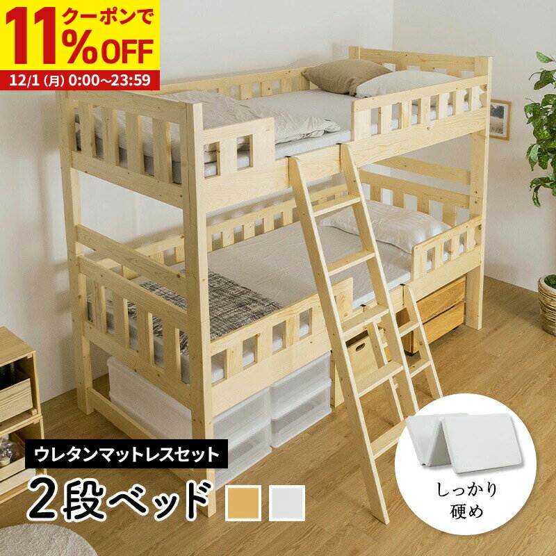 【11%OFFクーポン配布中★12/1に使える】 二段ベッド 2段ベッド ウレタンマットレス付 広々収納スペース二段ベッド フレームのみ 木製ベッド シングルベッド 無垢 スライド 子供部屋