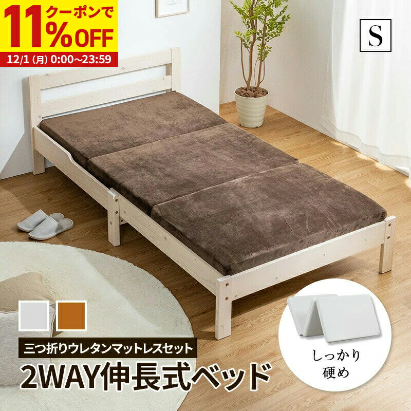 【11%OFFクーポン配布中★12/1に使える】 伸長式ベッド 天然木パイン無垢 シングルベッド ウレタンマットレス付 すのこベッド 無段階で好みのサイズ 伸長ベッド 木製 伸張 伸縮 スノコ 省スペース 180cm ソファベッド ソファーベッド