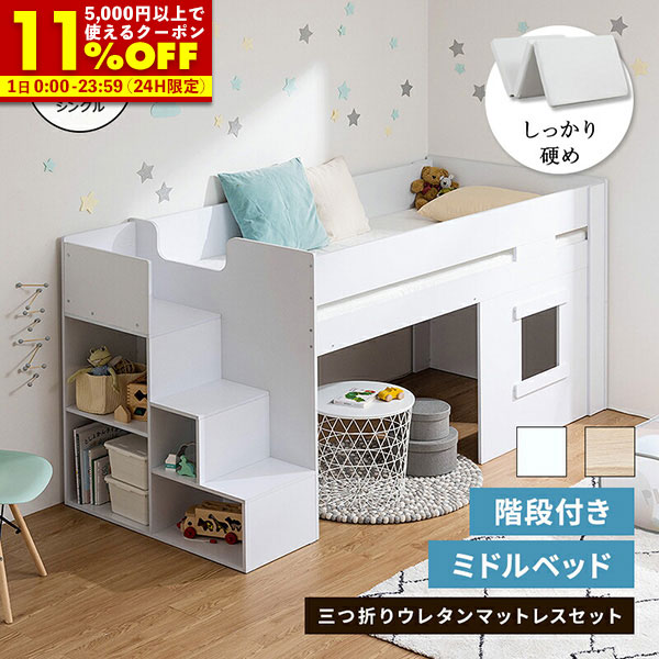 【クーポンで11%OFF★12/1 0:00〜23:59】 システムベッド ロフトベッド ミドルベッド ベッド マットレス付き ウレタンマットレス マットレスセット 高反発 厚さ10cm 階段 階段付き シングル ロフト ベット 子供部屋 収納 子供 キッズ 一人暮らし ナチュラル ホワイト