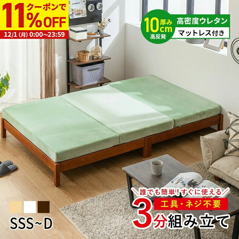 【クーポンで11%OFF★12/1 0:00〜23:59】 約3分で組立完了 すのこベッド ベッド マットレス付き 工具不要 ネジ無し 簡単組み立て ウレタンマットレス マットレスセット 高反発 三つ折り シングル セミダブル ダブル セミシングル セミシングルショート ベット 天然木