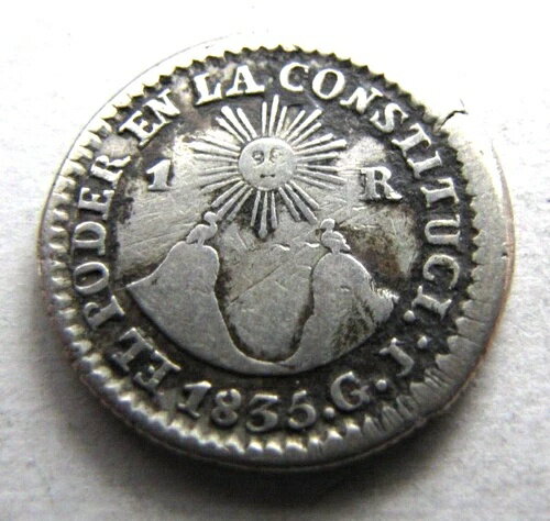 エクアドル KM17 1 レアル 1835 GJ キト。タイプとしてはVF程度のコンディション。希少!