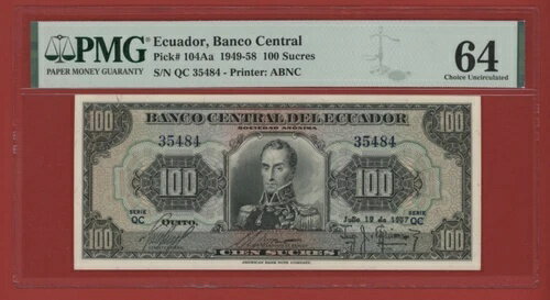 エクアドル 100 スクレ 19-7-1957 QC ピック # 104A ? PMG 64 チョイス 未流通。