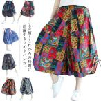 エスニック柄パンツ ガウチョパンツ スカーチョ ワイドパンツ 7分丈 クロップド丈 ボトムス ガウチョ 総柄 プリント 綿麻 麻混 大きサイズ 体型カ