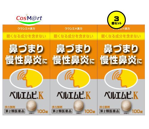 【3個セット】 【第2類医薬品】 クラシエ ベルエムピK葛根湯加川キュウ辛夷エキス錠 100錠 ベルエムピ かっこんとうかせんきゅうしんい カッコントウカセンキュウシンイ 鼻づまり 蓄膿症 副鼻腔炎 慢性鼻炎 (4987045129247-3)
