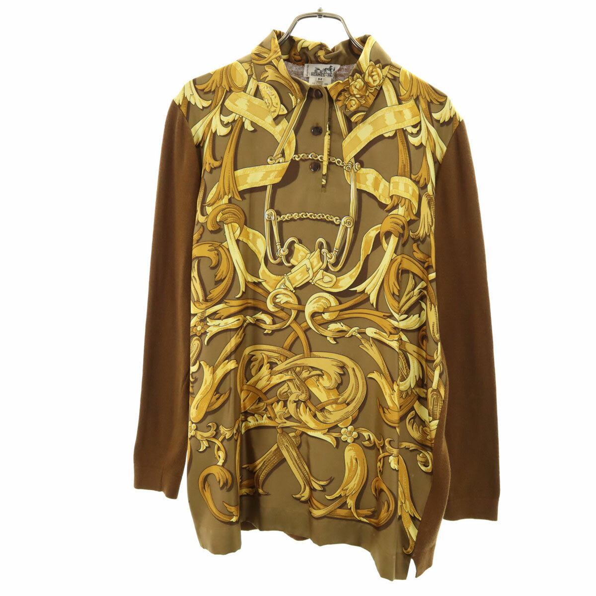 古着 HERMES エルメス イタリア製 オールド 総柄 長袖 ニット切り替え シャツ M ブラウン レディース 【中古】 【PD】