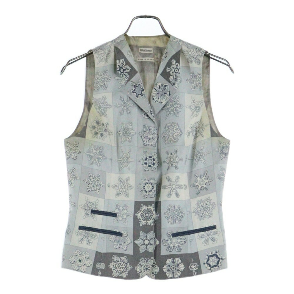 HERMES(エルメス) サイズ:36 スノーフレーク 雪の結晶総柄プリント シルク ノースリーブ ジャケット ジレ ベスト グレー/ライトブルー【中古】【程度B】【カラーグレー】【オンライン限定商品】