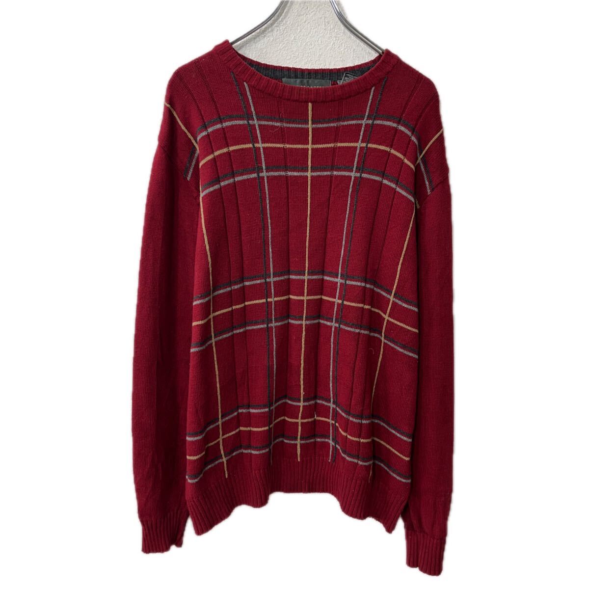 【中古】【古着】 OSCAR DE LA RENTA コットンニット セーター XL レッド コットン100% チェック柄 プルオーバー トップス 秋物 a711-6103