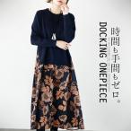 ワンピース レディース ネイビー オレンジ 長袖 ロング丈 ニット フレア 異素材 オータムカラー 花柄 重ね着風 時間も手間もゼロ OTONA 40代 50代 60代