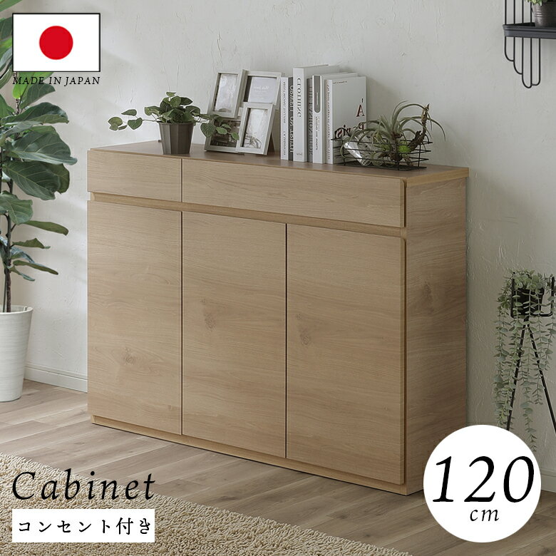 \全商品に使える11%offクーポンあり/ キャビネット サイドボード 120cm幅 収納 リビング収納 カウンター下 開き扉 引き出し 薄型 おしゃれ シンプル 引出箱組 フルスライドレール 2口コンセント付き 耐震ダボ仕様 強化シート ナチュラル ホワイト