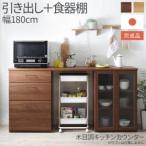日本製完成品 幅180cmの木目調ワイドキッチンカウンター Chelitta チェリッタ 2点セット レンジ台+食器棚