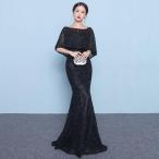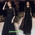 カラードレス ブラック ワインレッド 5分袖 ロングドレス 演奏会 発表会 大人 パーティードレス ファスナー レース カクテルドレス フォーマル 黒 赤 キラキラ