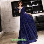 カラードレス ロングドレス 演奏会 発表会 カクテルドレス ブルー Vネック イブニングドレス ファスナー 半袖 パーティードレス おしゃれ ファッション