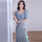 カラードレス カクテルドレス ロングドレス パーティードレス 発表会 演奏会 ステージドレス イブニングドレス 大人 ブルー 青 マーメイドライン スパンコール
