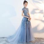 カラードレス パーティードレス 演奏会 発表会 イブニングドレス フォーマル カクテルドレス コンサート 結婚式 ブルー 半袖 ハイネック ファスナー トレーン
