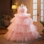 カラードレス ピンク フリル チュール 演奏会 発表会 二次会 花嫁 ウエディングドレス ウェディングドレス ロングドレス Aラインドレス プリンセスドレス