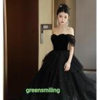 カラードレス ブラック オフショルダー プリンセスドレス 結婚式 二次会 発表会 黒 ロングドレス ウェディングドレス ウエディングドレス