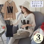 カットソー キャミソール 2点セット レディース 大きいサイズ 七分袖 Vネック 透け感 ゆったり 体型カバー ロゴ カジュアル
