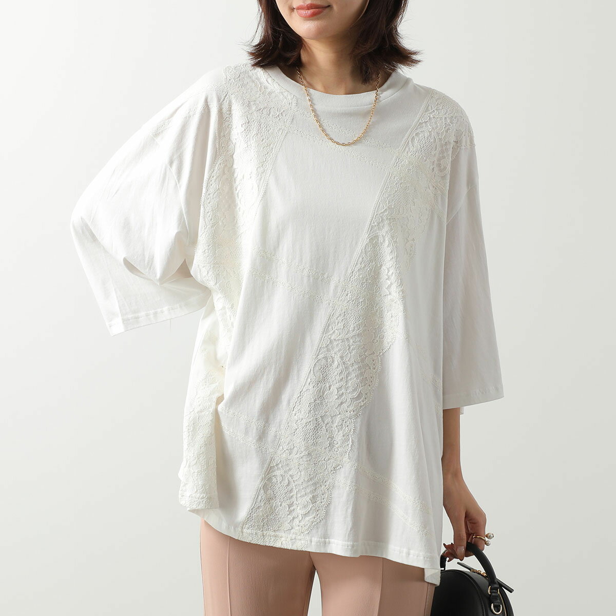 N°21 ヌメロヴェントゥーノ カットソー F042 6330 レディース Tシャツ クルーネック レース 七分袖 ロゴ ストレッチコットン オーバーサイズ カラー2色