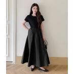 ワンピース レディース 3色 低身長 カットソー 半袖 クルーネック フレア 接触冷感 異素材ドッキング 春夏