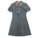 美品 GUCCI グッチ フラワー エンブロイダリー デニム ワンピース ドレス カットソー インターロッキング 花柄 刺繍 38 インディゴ レディース 古着 中古