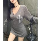 ワンピース 「2点セット」インナーレースカップ付きキャミソール+長袖Vネック十字架ワンピース