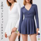 ヨガ ワンピース レディース 長袖 Vネック 2点セット 吸水 速乾 フレアスカート ショートパンツ ハイウエスト ポケット 薄手 無地 白