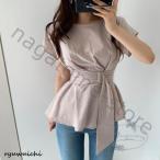 トップス レディース コンサバ ブラウス ペプラム風 ウエストマーク 無地 半袖 カットソー フレア きれいめ 体型カバー 可愛い おしゃれ 大人 デート