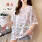 ゆるTシャツ 透け感 ゆったり Vネック 五分袖 スマイル にこにこ レディース トップス